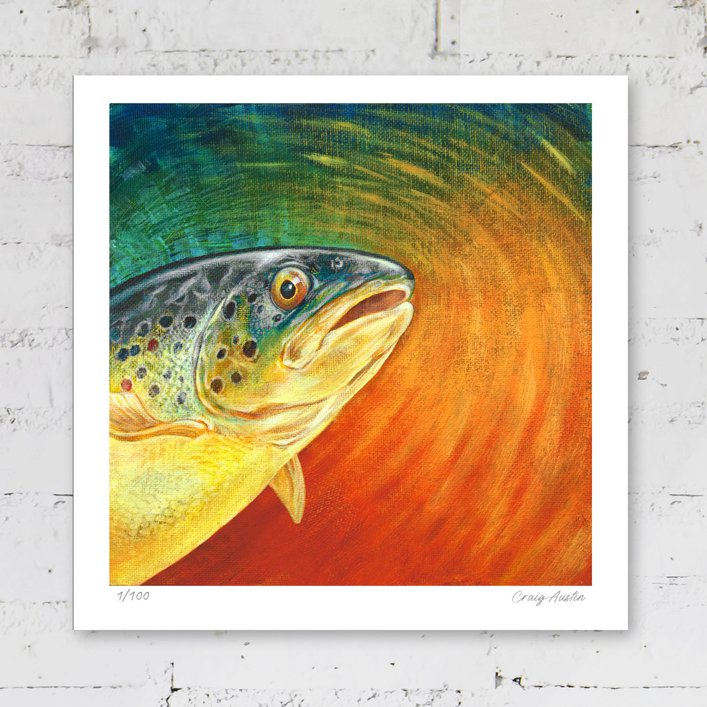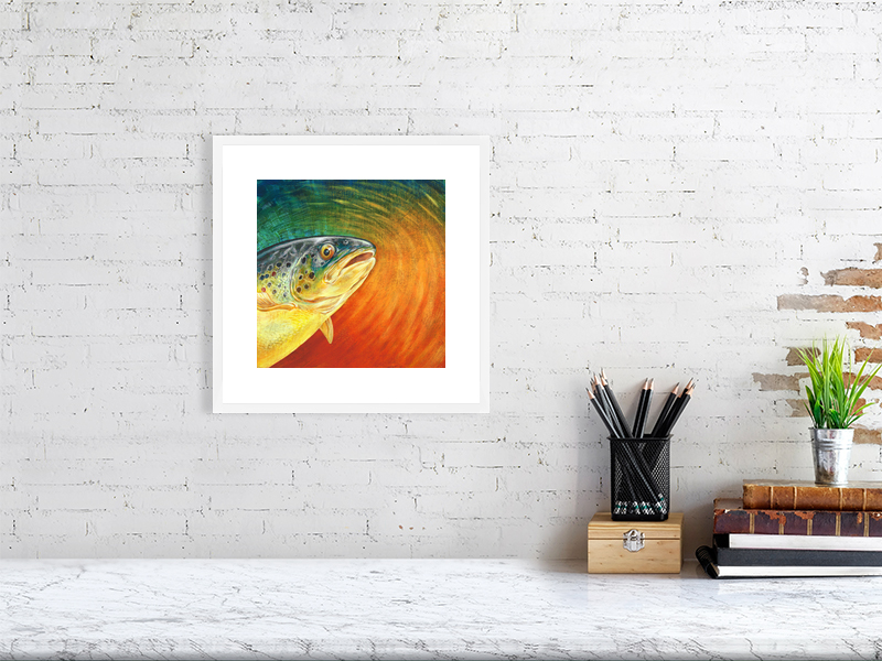 Trout painted in acrylic on canvas board. Available as a signed limited edition print unframed, or open edition in a white or oak frame.