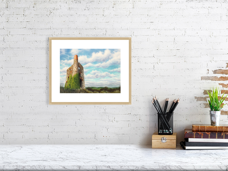 This painting is shows an engine house at Wheal Uny, a historic mining site to the south of Redruth, Cornwall. It mined tin and copper, and has two engine houses, a number of shafts and a chimney, dating from around 1800.
