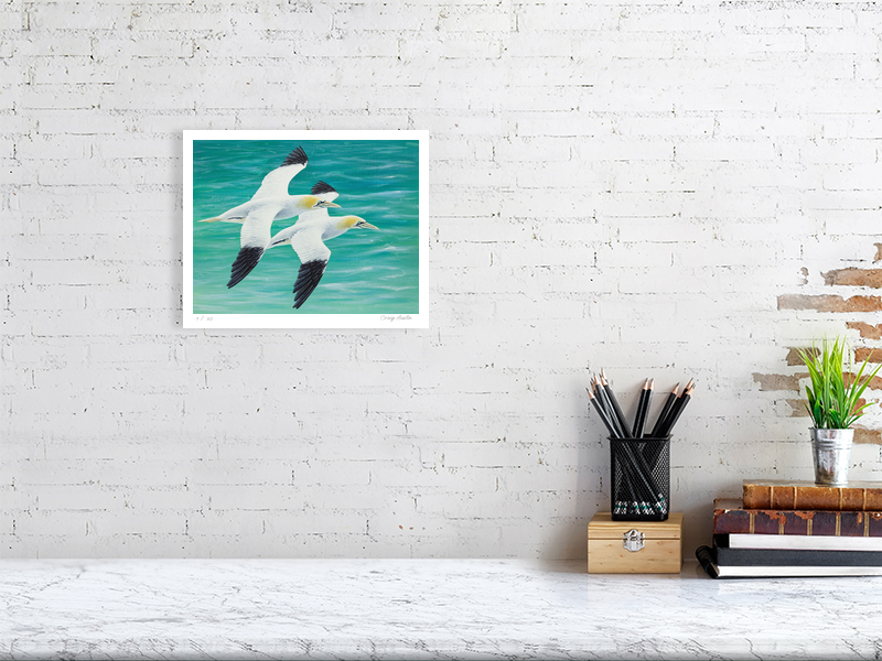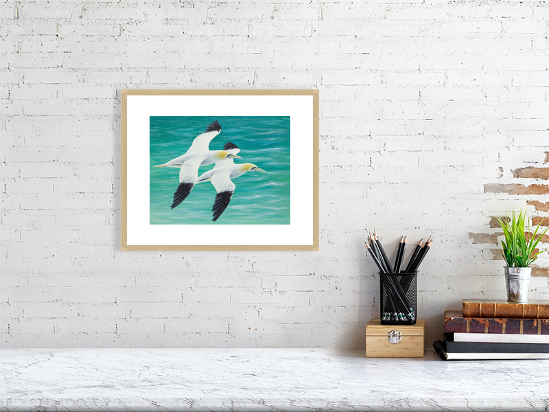 Pair of gannets flying over the sea, painted in acrylic. Available as a signed limited edition print unframed, or open edition in a white or oak frame.